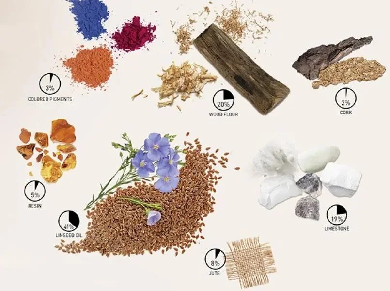 A linóleum egy szinte teljesen természetes anyagokból készülő padlóburkolat, amelyet már több mint 150 éve használnak. A Gerflor linóleum burkolatai például 98%-ban természetes anyagokból készülnek. Fő összetevői: